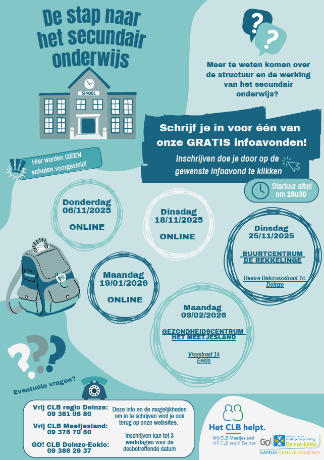 Vragen kan je rechtstreeks aan je CLB-medewerker stellen. Bovenaan deze pagina vind je de link "CLB-teams". Kies vervolgens de juiste gemeente waar je school gelegen is: bij de naam van je school, vind je je CLB-team. Op de foto zie je onmiddellijk wie dit is en vind je alle nuttige contactgegevens. Hieronder vind je informatie over gezondheid, studeren, …